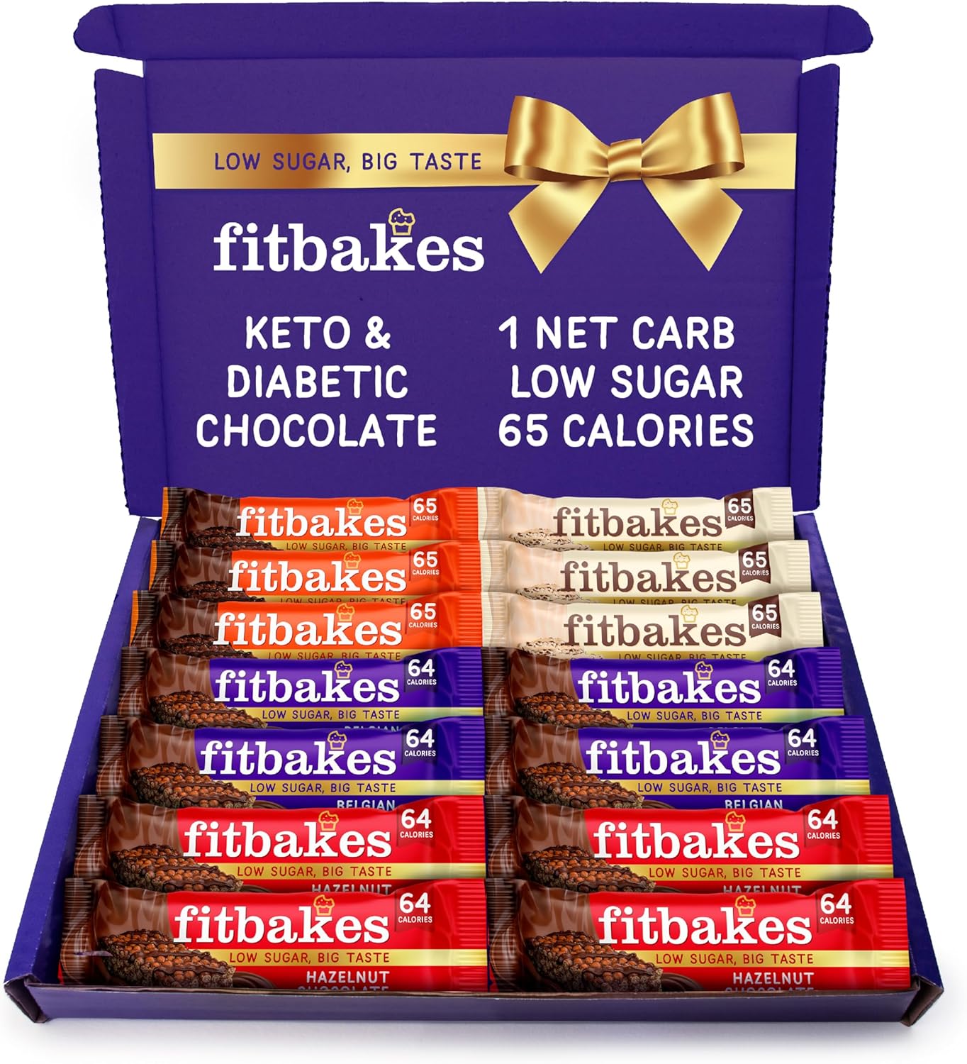 【Flash Sale】Fitbakes Gifts Diabetic Chocolate Gift Box (14x19g) Crunchy Mini Chocolate Keto Snack Bars, Sweet Diabetic Biscuit Food Treats Hamper, 65 Calories, Low Calorie Snack For Women & Men, Fit Bake