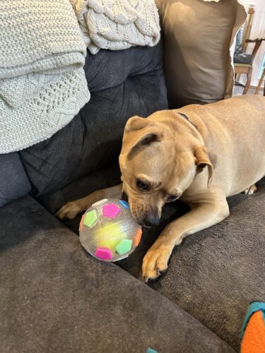 My dog really loves this toy! It’s a ton of fun. She’s been running with it and throwing it to herself. Its unusual shape makes for some silly bouncin...More